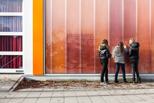De nieuwe aula zorgt naast meer evenwicht in gebruik van gebouwvoorzieningen voor een imagoverandering. De entree, patio en aula zijn nu overal zichtbaar en fysiek verbonden via grote transparante roldeuren. Zo is de patio vanaf de speelplaats direct toegankelijk via de aula.