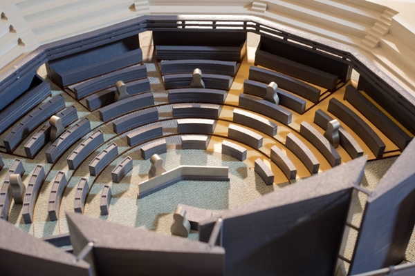 Een maquette van de Plenaire Zaal van de Tweede Kamer moet de beleving van het gebouw voor blinden en slechtzienden vergroten.