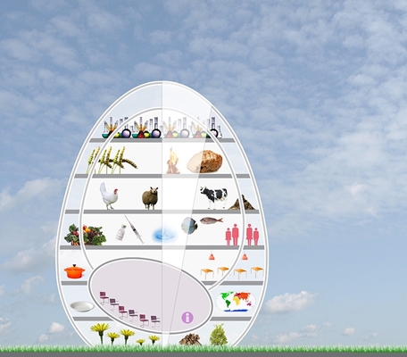 “Wanneer het voedselcentrum gebouwd zou worden, zal het ook daadwerkelijk een ei-vorm krijgen”, verzekert een woordvoerder van de stichting die de haalbaarheid van het project onderzoekt. “Er is gezocht naar een opvallende, aansprekende vorm. En een ei staat natuurlijk symbool voor nieuw leven. Het ei is een oercel waarin zowel dierlijk als plantaardig samenkomen, net als de elementen aarde, water, lucht en vuur. Dat past bij de ambitie om via het centrum mensen bij elkaar te brengen.” Bij het project is nog geen architectenbureau betrokken.