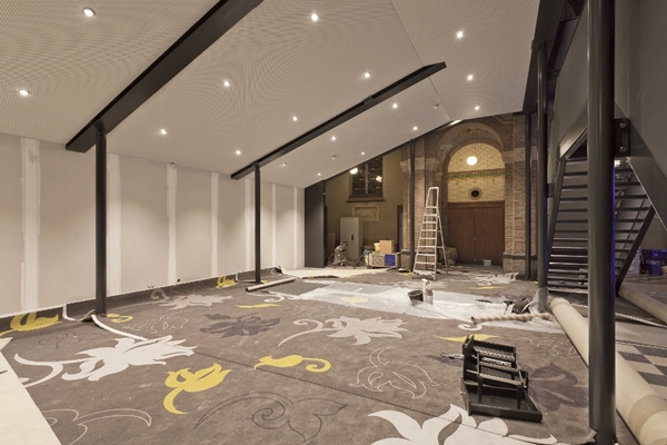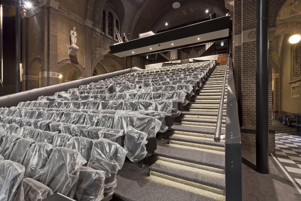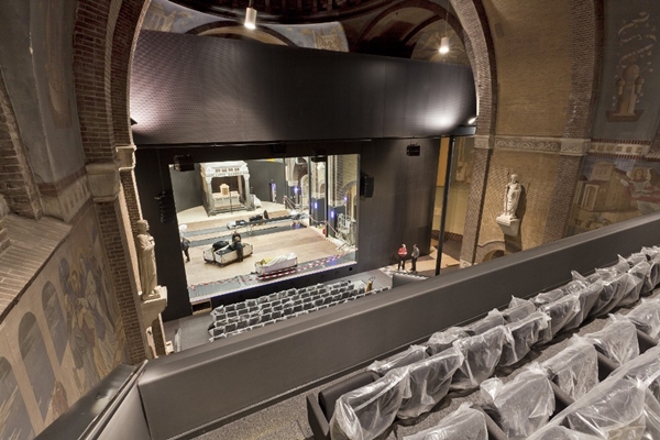 De glas-in-loodramen van het voormalige godshuis zijn zowel functioneel als esthetisch aangewend, zegt cepezed. “Ten behoeve van een voldoende donkere theaterzaal zijn zij geblindeerd, maar steeds met verlichting tussen de blindering en het raam.”