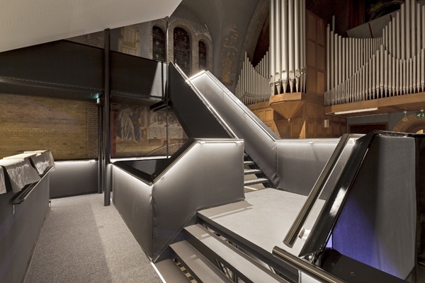 “In de apsis van de kerk is de blindering aan de binnenkant geplaatst zodat de verlichte ramen een uitstraling naar buiten hebben en functioneel zijn voor de herkenbaarheid en aantrekkelijkheid van het kerktheater vanaf de straatzijde en parkeergarage.”