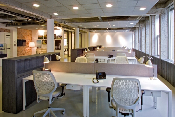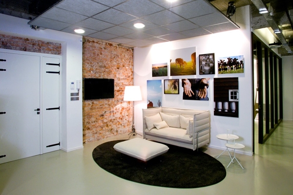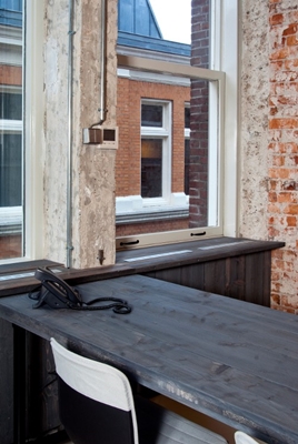 Houten meubels zijn gecombineerd met veelal strak vormgegeven kantoormeubilair. Ruw beton en baksteen contrasteert met strakke, witte wanden en deuren. De plafonds zijn voorzien van akoestische eilanden.