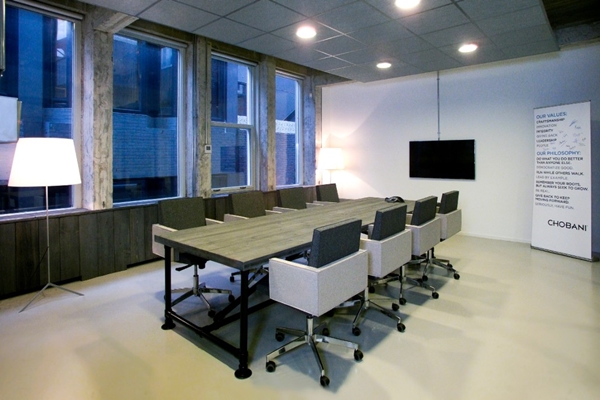 Speciaal gemaakte houten kasten en tafels en deels onafgewerkte muren en open plafonds dragen bij aan de uitstraling die het merk Chobani nastreeft.