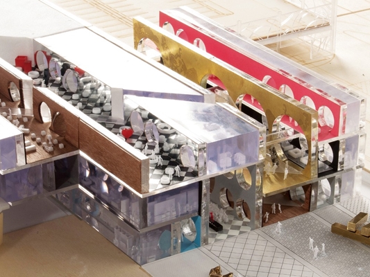 De gangen zijn van elkaar gescheiden door multifunctionele wanden met cirkelvormige uitsneden, waardoor de bezoekers kunnen doorsteken. Ook zorgen ze volgens OMA voor spannende wisselende uitzichten op de naastgelegen ruimtes.