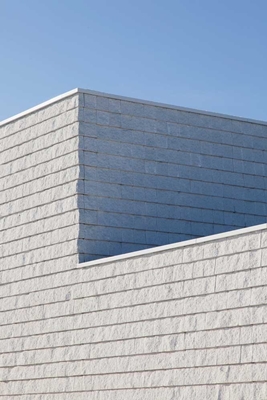 Voor het gebouw is een gevelsteen ontwikkeld van lichtgrijs beton met Noors marmertoeslag. Deze vierkante steen is handmatig schuin gebroken en met een minimale voeg gemetseld. Hierdoor ontstaat een grof en tactiel oppervlak waarin banen van oplichtende ‘marmerglinsters’ worden afgewisseld met schaduwstroken.