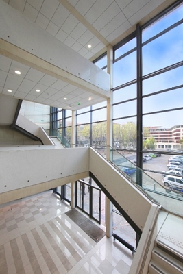 Ook op de eerste verdieping, waar de administratieve diensten van de nieuwe campus Saint-Charles zijn ondergebracht, is een ruime verkeerszone gecreëerd door de scheidingsmuur te vervangen door kolommen. De bibliotheek op de tweede verdieping en de entreehal hebben een glazen façade gekregen. In de entreehal is een trap en lift toegevoegd, vervaardigd uit staal en wit beton. Het vormt een antwoord op de bewaard gebleven originele trap. Op verschillende plekken in het gebouw zijn de kleuren rood en blauw toegepast, waarmee wordt verwezen naar de voormalige mannen- en vrouwenvleugel van het hospitaal.