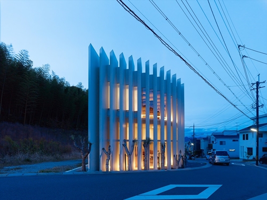 In de Japanse stad Kyoto is een waaiervormig huis opgeleverd. De voorgevel van de woning bestaat uit een serie schijven die worden verbonden door glas. Onder invloed van de zon verschuiven schaduwlijnen en licht in het interieur.