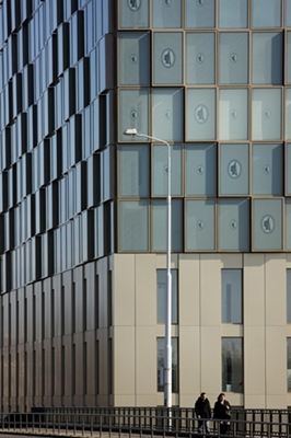 De cassettegevel krijgen door de terug liggende of uitstekende panelen reliëf, terwijl verschillende kleuren glas de textuur versterkt. “De meer uitstekende panelen reflecteren iets meer, en zijn net even wat intenser van kleur dan de naar achter liggende panelen”, aldus het architectenbureau. Ondergronds is een parkeergarage gesitueerd.