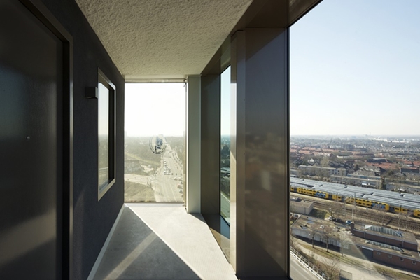 De dertien lagen tellende woonwerktoren heeft een drie verdiepingen omvattende plint die is gereserveerd voor kantoren. De etages daarboven bevatten sociale woningen. Deze zijn toegankelijk via galerijen die grenzen aan een cassettegevel. Deze halve meter diepe panelen bevatten een bankje, twee stoelen met een tafel of ruimte voor een plant.