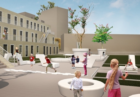 ontworpen in opdracht van gemeente Rotterdam. Het getrapte bouwvolume met twee geïntrigeerde speelpleinen wordt gekenmerkt door een flexibele opzet en duurzame materialen.