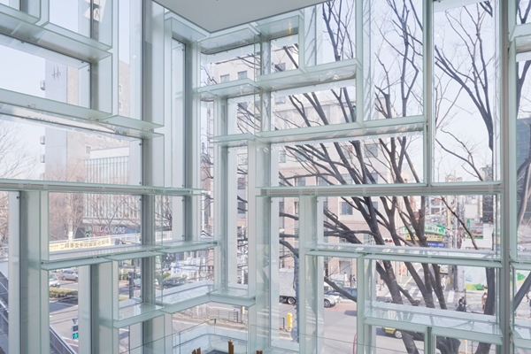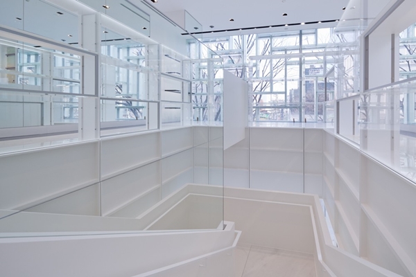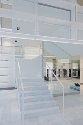 Het uitstallen van de producten in de gevel bespaart winkelruimte, terwijl de bezoeker ook nog steeds naar buiten kan kijken. Klanten kunnen de verdiepingen bereiken via de centrale trap, die is omringd door 105 semitransparante panelen.