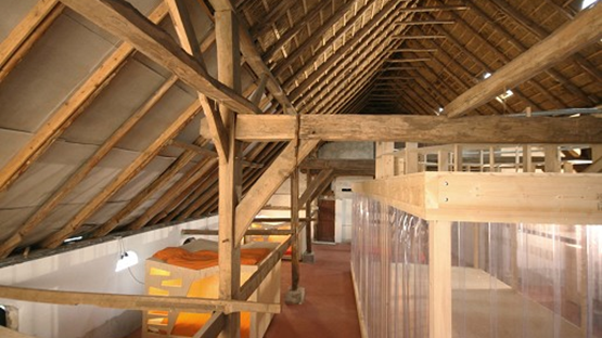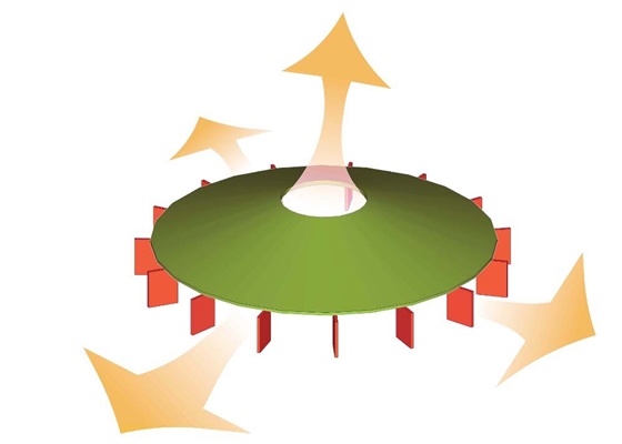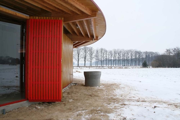 Een radiale constructie met grote gelamineerde houten spantbenen reikt vanuit het gevelvlak tot aan de grote licht- en luchthapper in het midden. Het dakoppervlak is bedekt met grassen en bloeiende planten. Voor de dakrand en het dakoverstek is gekozen voor een helder rode kleur om het volgens de architect “tot een uitnodigend en stoer baken in het groen” te maken.