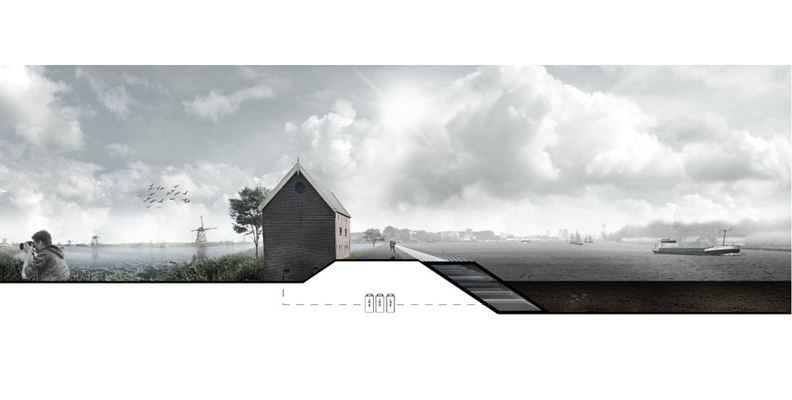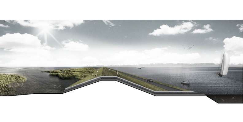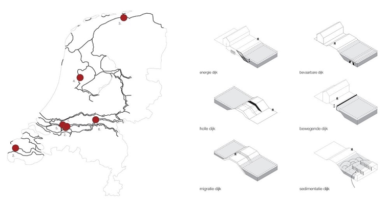 bedacht. Zo stelt het team een energiedijk voor (bij Nieuw Lekkerland), waarbij de dijkverzwaring zo is ontworpen dat de dijk een generator van natuurlijke energieproductie vormt. Een dijk verzwaren door middel van een functioneel volume kan dubbel ruimtegebruik opleveren, bijvoorbeeld in de vorm van woon- of publieke ruimte. Bij Uitdam, aan het Markermeer, stelt het team een nieuwe, bevaarbare dijk voor. DELVA en Dingeman Deijs laten zien dat daarbij kan worden uitgegaan van de archetypische, oer-Hollandse dijk. De erfgoedwaarde van lange lijnen in het landschap wordt behouden en versterkt, of zelfs teruggebracht.