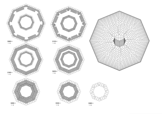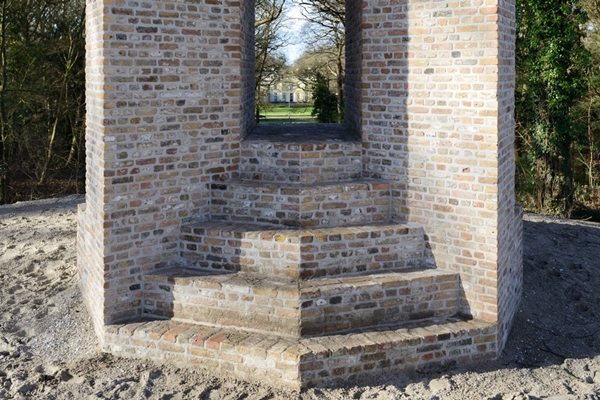 De nieuwe koepel is volledig opgetrokken uit gerecyclede baksteen, IJsselsteentjes. Van deze grove stenen is een strakke sculptuur, met scherpe hoeken gemaakt. De koepel is steen voor steen in revit uitgetekend en gebouwd door een ervaren metselaar, aldus Marjolein van Eig, projectarchitect van de koepel.