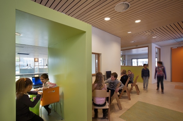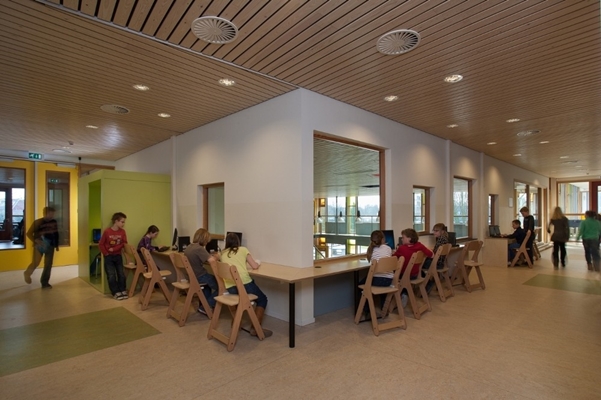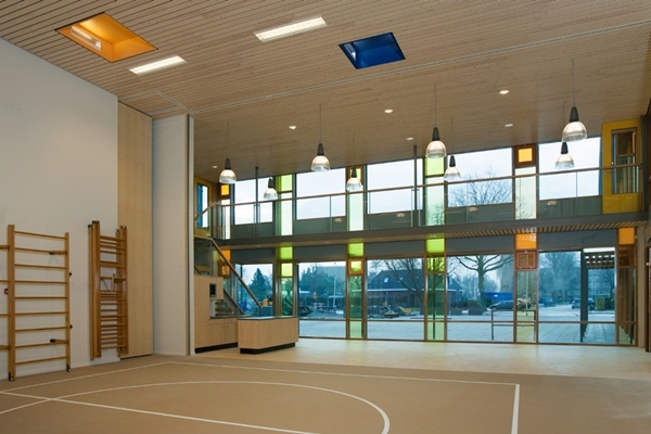 De onderwijsclusters liggen binnen het gebouw rond een centrale ruimte, een ‘binnenplein’ dat wordt gevormd door de aula en een speellokaal. Dit binnenplein sluit aan op het schoolplein buiten. Zo ontstaat een ruimtelijke reeks, waarmee school en buurt op elkaar worden betrokken. De onderwijsclusters hebben elk een eigen entree en bestaan uit telkens een aantal lokalen. Tussen de lokalen liggen kleine, rustige werkruimten. In een apart deel van het gebouw is de Buitenschoolse Opvang (BSO)