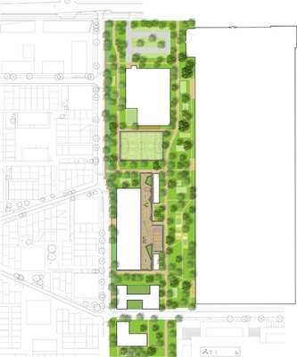 De scholen, die worden opgezet als Brede School, zijn geplaatst in de nabijheid van de woonbuurt; de speelplaats strekt zich uit ten westen van het schoolgebouw en wordt van de omgeving afgebakend door een niveauverschil. Het CKG staat los in het groen, op afstand van de publieke voorzieningen. De inplanting van de volumes laat een goede sociale controle toe, aldus de architecten. Met het parkachtige karakter laten de architecten het projectgebied aansluiten op de nabijgelegen groengebieden. Het parkgebied betekent levert ook een meerwaarde voor de aangrenzende woonbuurt. Het gebied is zo ingericht dat verschillende vormen van gebruik tegelijkertijd mogelijk zijn, aldus Geurst&Schulze en HOSPER.