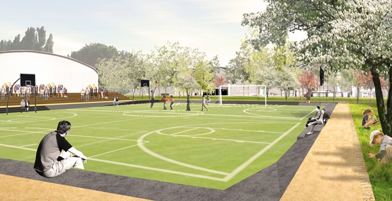 heeft het winnende ontwerp gemaakt voor een gebied met gemeenschapsvoorzieningen in het Antwerpse Regatta. De bureaus stellen een samenhangende parkachtige omgeving voor.