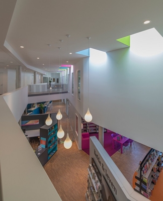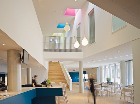 De donkere kleur van de gevel contrasteert ook met het lichte interieur. De meeste wanden zijn wit met uitzondering van enkele felle kleuraccenten in nissen. Op diverse plekken zijn brede zit-vensterbanken geïntrigeerd om het ontmoeten te stimuleren. Her en der zijn houten elementen te onderscheiden.