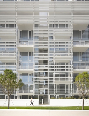 De horizontale lamellen die over een groot deel van de gevel lopen, zijn onderdeel van een brise-soleilsysteem. Volgens Richard Meier creëren de lamellen een interessant lichtspel in de ruimte tussen de lamellen en de gevel, met name als ze het zonlicht bij zonsopkomst en –ondergang filteren.