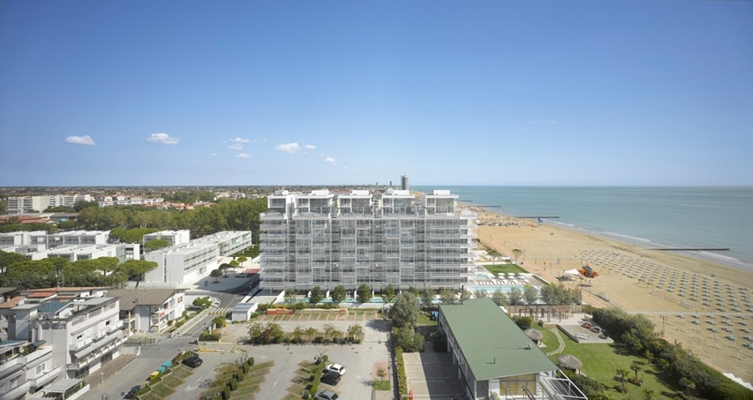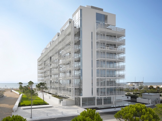 ontworpen appartementencomplex Jesolo Lido Condominium is onlangs opgeleverd in de Italiaanse badplaats Jesolo. Ondanks de tien bouwlagen waaruit het appartementencomplex bestaat, oogt het witte gebouw transparant en lichtvoetig.