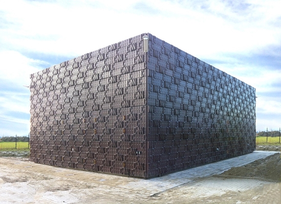 Maar de bedoeling is dat de biovergister die recentelijk is gebouwd in de toekomst biogas gaat leveren via het gasontvangststation. “Dat gegeven hebben we in het gevelpaneel van het gebouwtje verbeeld. Op het paneel staat de chemische code voor aardgas – dat is de ‘oude’ fossiele wereld. Maar het paneel zelf is gemaakt van biobased materiaal – de belofte voor de toekomst. Het station staat symbool voor een transitie die niet alleen over energie maar ook over grondstoffen gaat.