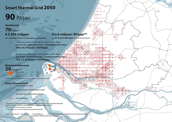 Een voorbeeld: slimme, ondergrondse koppelingen tussen gebieden waar een overschot aan warmte is (de petrochemische industrie) en gebieden waar warmte nodig is (glastuinbouw en steden). In combinatie met geothermie kan daarmee aan een ‘smart thermal grid’ worden gebouwd dat in de gehele warmtebehoefte van Zuid-Holland voorziet. Dat is wat Studio Marco Vermeulen onder anderen heeft voorgesteld in het perspectief Biobaseload 2050 voor de provincie Zuid-Holland, een toekomstvisie waarin de hele provincie ‘draait’ op duurzame energie.