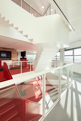 Het compact bouwvolume, bestaande uit negen lagen, beschikt over open werkplekken, huiskamers, spreekkamers, concentratiecapsules, auditoria en vides. Het interieur is opgedeeld in verschillende delen gekenmerkt door wisselende combinaties van composietmaterialen, glas, staal, hout en vilt. Het volledige interieur-inbouwpakket en een vast-meubilair lijn is door Architectuurstudio HH ontworpen.