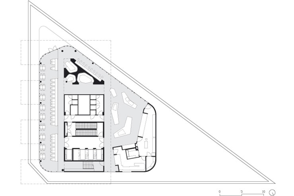 Op een hoek van het gebouw hangt een glazen volume over zes lagen waarin gestapeld drie serres met tuinen in een energie neutrale omgeving zijn ondergebracht, aldus de architect. Dit hangende serrevolume en de glazen erkers op het dak maken van het kantoorpand een opvallende verschijning.