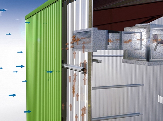 Colorcoat RenewSC is, zo legt Tata Steel uit, een systeem dat warmte wint door een microgeperforeerde gevelplaat door de zon te laten opwarmen. Een ventilator creëert onderdruk, waardoor buitenlucht via de perforaties in de