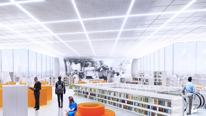 Op de begane grond zal een lobby dienen als openbaar plein dat de relatie tussen de kade en de bibliotheek versterkt, aldus OMA. De eerste verdieping huisvest een leesruimte met vrij uitzicht op het water en de stad. Deze transparante ruimte manifesteert zich als een groot gat in het kruisvormige bouwvolume.