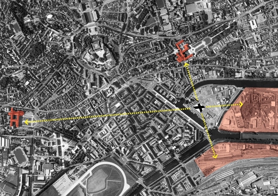 De bibliotheek verrijst aan de waterkant van het Bassin Saint-Pierre en maakt deel uit van de revitalisatie van het industriële havengebied in het centrum van Caen. Met zijn X-vorm verbindt het gebouw vier belangrijke plekken in Caen: de abdijkerken Abbaye-aux-Hommes in het oosten en Abbaye-aux-Dames in het noorden, het zuidelijk gelegen treinstation en een nieuw stedelijk ontwikkelingsgebied in het westen.