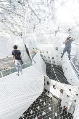 De door kunstenaar en architect Tomás Saraceno ontworpen constructie behelst 2500 vierkante meter en bestaat uit drie lagen. Op de netten liggen een aantal met lucht gevulde kogels. Het ‘zwevende’ werk van de in Berlijn wonende Argentijn speelt in op twee emoties van de mens: plezier en angst.