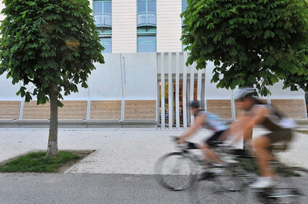 De muur bestaat uit prefab betondelen met een lichte knik en een zitvlak. De geknikte vorm biedt beschutting en doet enigszins denken aan een loge, zo leggen de architecten uit.