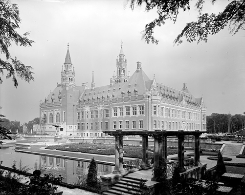 in Den Haag is gebouwd tussen 1907 en 1913, nadat in 1899 was besloten om een 'Permanent Hof van Arbitrage' op te richten dat zou bemiddelen bij internationale conflicten en oorlogsdreigingen.