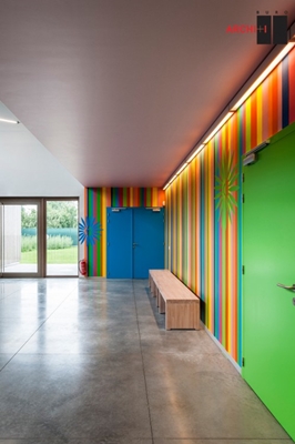De foyer wordt verlevendigd met een wand van kleurstrepen. Rijgkralen voor kleuters vormden de inspiratie voor de kleuren. Daarboven is een lijntekening van Dick Bruna aangebracht. Gekleurde kapstokjes en kriskras opgehangen tl-buizen dragen verder bij aan een speelse sfeer.
