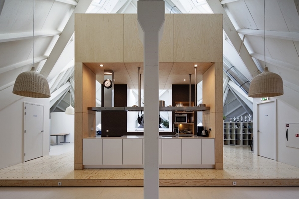 “Het middenelement wordt drie meter boven het hoogst vloerveld beëindigd met een lounge waar bewoners door het beglaasde kubusdak zicht hebben op de skyline van Rotterdam”, zegt Peronal Architecture. Het bureau is niet onbekend met de kubuswoningen: in 2009 realiseerde het een Stayokay-hotel in een deel van het complex.