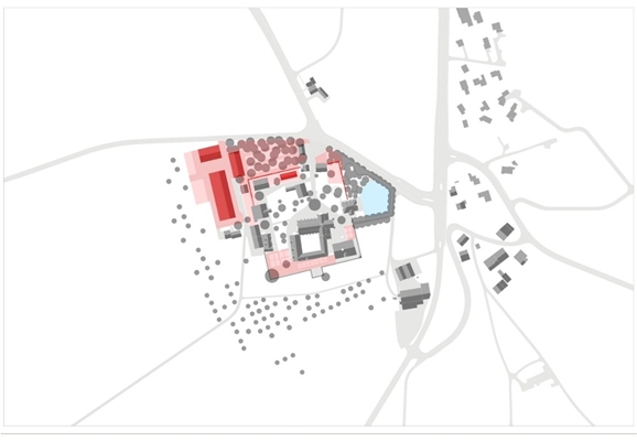De oude kloostermuur wordt herbouwd waardoor er een ‘binnen de muur’ en een ‘buiten de muur’ ontstaat. Deze scheiding is in het nieuwe plan zowel in de architectuur als in de functies te herkennen. Tevens biedt deze scheiding ruimte voor eventuele toekomstige uitbreidingen.