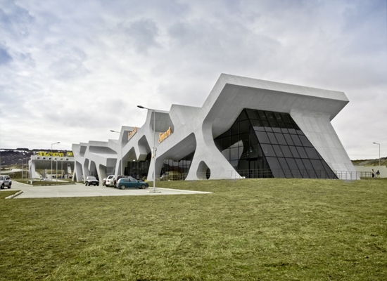 Van verre zie je de grens met Georgië al opdoemen: Mayers creatie van wit beton doet sterk denken aan het mysterieuze Georgische alfabet. Zijn golvende gebouwsilhouet steekt scherp af tegen het achterliggende heuvellandschap en is behalve grenspost tevens uitkijktoren. Achter de toeristeninfobalie blijkt dat ook het meubilair is afgestemd op de kenmerkende stijl van de Berlijnse architect en ook de klokvormige entrees sluiten aan op het gebouwconcept.