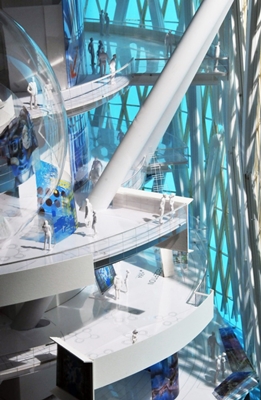 Op de vierhonderdvijftig meter hoge toren worden op drie verschillende hoogtes camera’s geplaatst, aan alle zes kanten van het gebouw, die de omgeving filmen. Deze films worden door middel van vijfhonderd rijen ledlampjes direct op de gevel getoond. De lampjes kunnen ook uitgeschakeld worden. Het grootste deel van de tijd zal de toren dan ook vermoedelijk gewoon zichtbaar zijn.