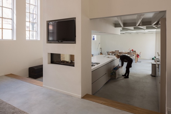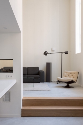 De gymzaal heeft een moderne uitstraling gekregen door de toepassing van wit gestuukte wanden, betonvloeren en houten trappen. Door het toevoegen van extra raamopeningen in de achtergevel komt het daglicht tot diep in de woning.
