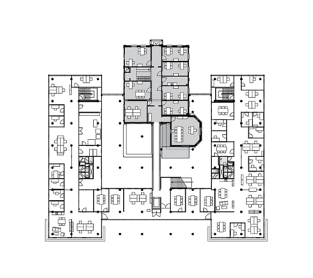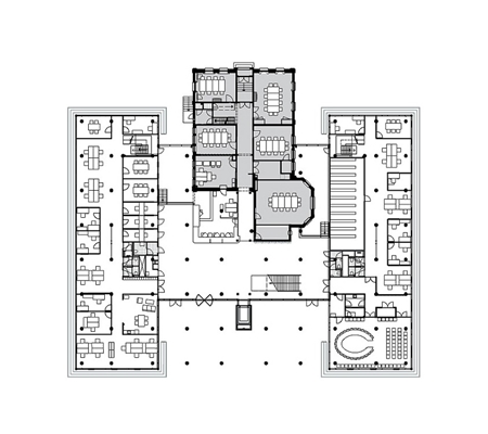 “De verschillende gebouwdelen zijn gegroepeerd rondom het monument, waarbij een continue interactie tussen oud en nieuw mogelijk is. Het transparante publieke binnengebied is gevormd door de ruimte die tussen oud en nieuw is ontstaan. Deze compacte opzet zorgt voor korte looplijnen en bevordert samenwerking tussen medewerkers”, zegt RAU.