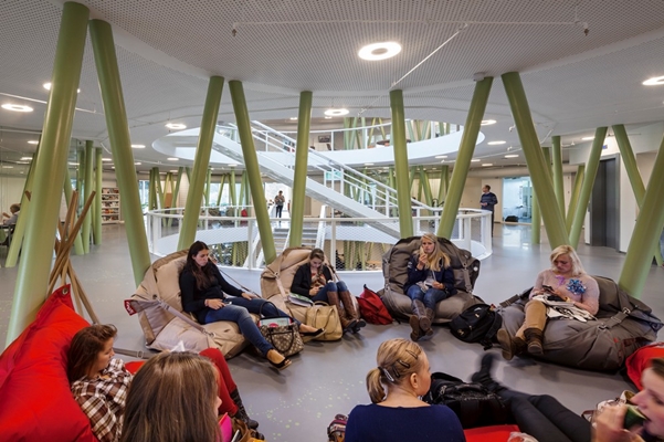 Het schoolgebouw, zo leggen de architecten uit, is ontworpen als een combinatie van ‘nest-ruimtes’ met vast gebruik, zoals practicumlokalen en kantoorfuncties, en de grotruimte daartussen, waarvan het gebruik onvoorspelbaar is. Die ruimtes kunnen het ene moment dienen voor onderwijs, het andere moment in bezit worden genomen voor ontspanning.