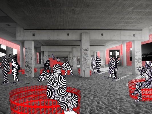 HUNK-design stelt voor om de huidige afrastering te vervangen door een signaalrood hekwerk, dat van het plafond tot aan de grond loopt. Daarmee wordt er een ruimte onder het perron gecreëerd voor evenementen en exposities. Door de openheid van de wanden voelt de bezoeker nog steeds dat hij in een overwoekerde ruïne staat, aldus het ontwerpbureau.