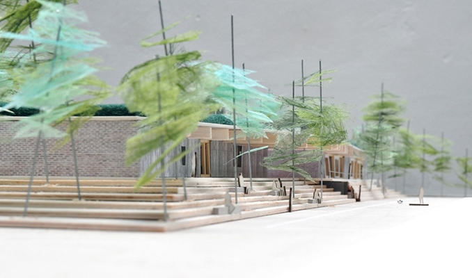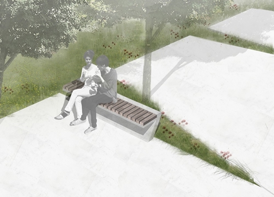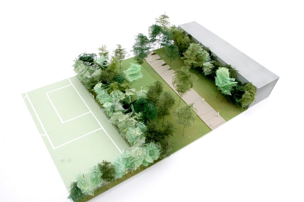 “De dubbele beleving in het park wordt gecreëerd door het strategisch inzetten van beplanting. De zorgvuldige gesitueerde boombeplanting vormt de kaders rondom de programmakamers en zorgt tegelijkertijd voor een maximale voegruimte en subtiele zichtrelaties tussen voeg en kamer. De voegen hebben door de boombeplanting een graduele en parkachtige rand en de kamers een harde en geometrische omkadering.”