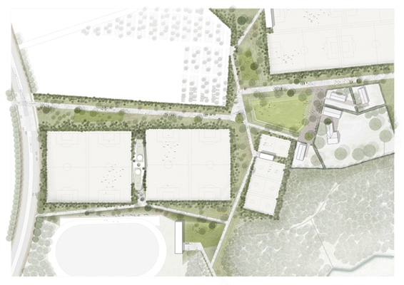“De oost-west hoofdroute leidt naar een nieuw groen parkplein, dat de centrale open ruimte vormt in het park. Deze ruimte wordt gevormd door een verdiept grasveld met zitranden, en daarnaast een halfverhard informeel ‘dorpsplein’ waaraan de omliggende verenigingsgebouwen gegroepeerd zijn. Op het plein vinden de jaarlijkse barbecues van alle clubs plaats, en op het verdiepte veld kan in de winter geschaatst worden.”