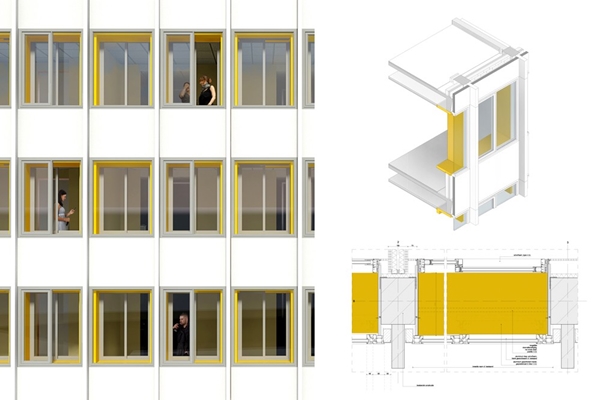 “De bedrijfsruimten worden afzonderlijk ontsloten aan de westzijde (A10-zijde) en zijn afgescheiden van de studentenhuisvesting. Aan de oostzijde wordt een nieuwe studentenentree op de begane grond geïntroduceerd door de toevoeging van een verhoogde pleinruimte die tevens dienst doet als ontmoetingsplek.”