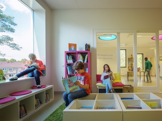 , extra aandacht voor akoestiek en verlichting en een vrije hoogte van 3,2 meter in de groepsruimtes. Voor de duurzaamheid zijn onder meer een warmte-koudeopslag en een energiedak toegepast.