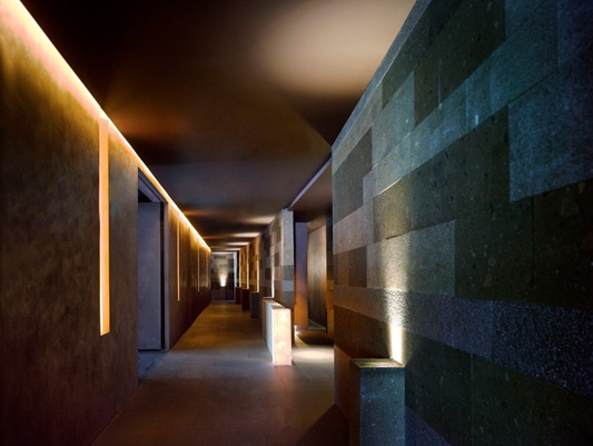 De architect heeft daartoe vooral natuurlijke materialen uitgekozen: ruw porfier en zandsteen in bruin-, geel- en roodtinten, marmorino stucwerk, koper en brons, ebbehout en bruin lederen meubelbekleding. Ze geven het restaurant een uitstraling van tijdloze luxe, wat Silvestrin nog versterkt door de natuurlijke materialen te combineren met pure, geometrische vormen.