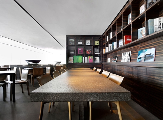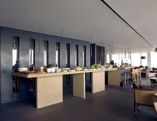 De gasten kunnen de feitelijke eetruimte betreden via de keuken. Daardoor ervaren ze voordat ze aan tafel gaan de kleuren, geuren en geluiden van het bereiden van het eten. Een verassende ingreep waarmee Silvestrin, in aanvulling op de natuurlijke materialen, de zintuiglijke ervaring van de gasten vergroot.