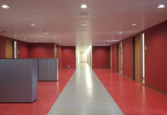 “De fysieke koppeling tussen bouwdeel A en B wordt gemaakt middels een drietal boven elkaar gelegen loopbruggen die de transparantie van de centrale hal intact houden. Deze hal vormt hiermee het synergetisch knooppunt waar alle bloedgroepen elkaar ontmoeten. Auditorium, espressobar, receptie, onder wijsruimtes, pantry’s en sanitaire ruimtes zijn alle opgenomen in de hal”, aldus Wiegerinck.